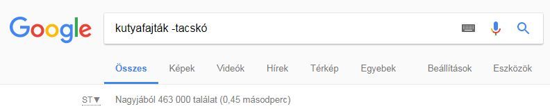 Ha keresési eredményei olyan találatokat is tartalmaznak, amelyek irrelevánsak az Ön számára, úgy lehetőség van kizáró kulcsszavakat alkalmazni, egyszerre akár többet is. Ehhez nincs más dolga, mint kötőjellel írni a kizárni kívánt kulcsszavakat a keresőbe. Példánkban olyan keresési eredményeket szeretnénk kapni, amelyek kutyákról szólnak, viszont nem tartalmazzák a tacskó szót.