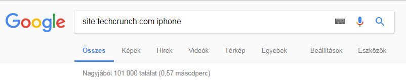 Ha kifejezetten egy adott oldalon szeretne keresni és az nem rendelkezik beépített keresővel, nincs más dolga, mint a site: paramétert használni a keresési kulcsszavak előtt vagy után. A lenti példában a techcrunch.com oldalon kerestünk iPhone-nal kapcsolatos híreket.
