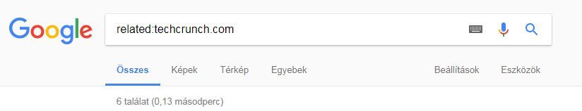 Ha már megtalált egy keresett oldal, kereshet hasonló tartalmú oldalakat is ha a related: paramétert használja. A Google így összehasonlítja a keresési eredmények tartalmát a referencia oldallal és hasonlóságuk, kapcsolódásuk alapján rangsorolja azokat Önnek.